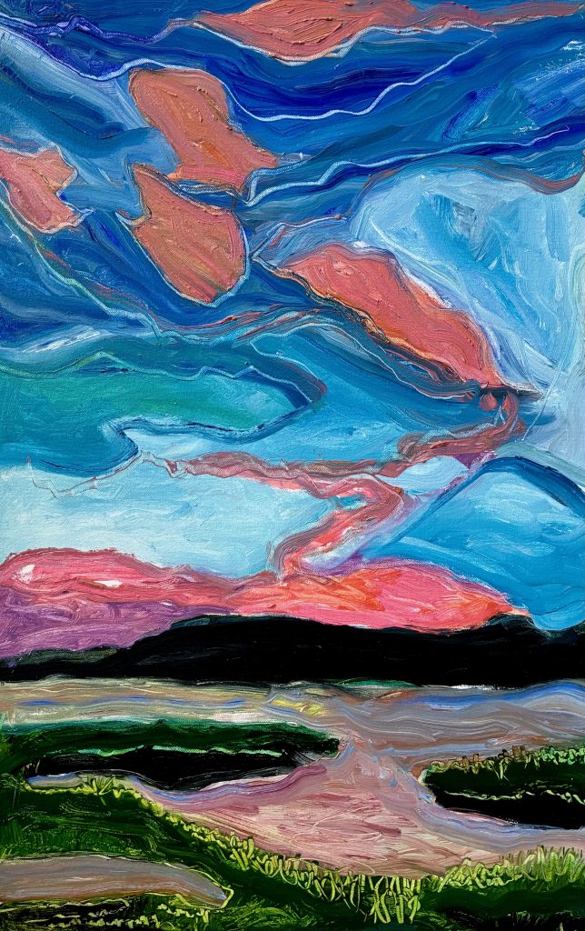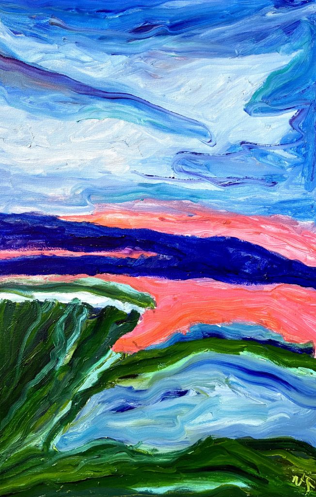These joyous paintings have been the mainstay of my work for the past fifteen years, work I usually say is my serious play! I have grown up in art museums, and my mentors come right out of art history. People often say my work is an amalgamation of artists such as Matisse, Van Gogh, Dufy, Bonnard, Niki de Saint Phalle, and Dubuffet. Among living painters, my favorite is David Hockney. These paintings reflect my home environments, my travels, and my memories of place. I love to capture the actual composition of a place, on land or sea. But then I like to interpret it, making up the colors, patterns, complex details, and giving the place unexpected multiple perspectives. Most of these works began outdoors with sketches, but were then painted indoors where the fantasy, whimsey, energy, and complexity take over.